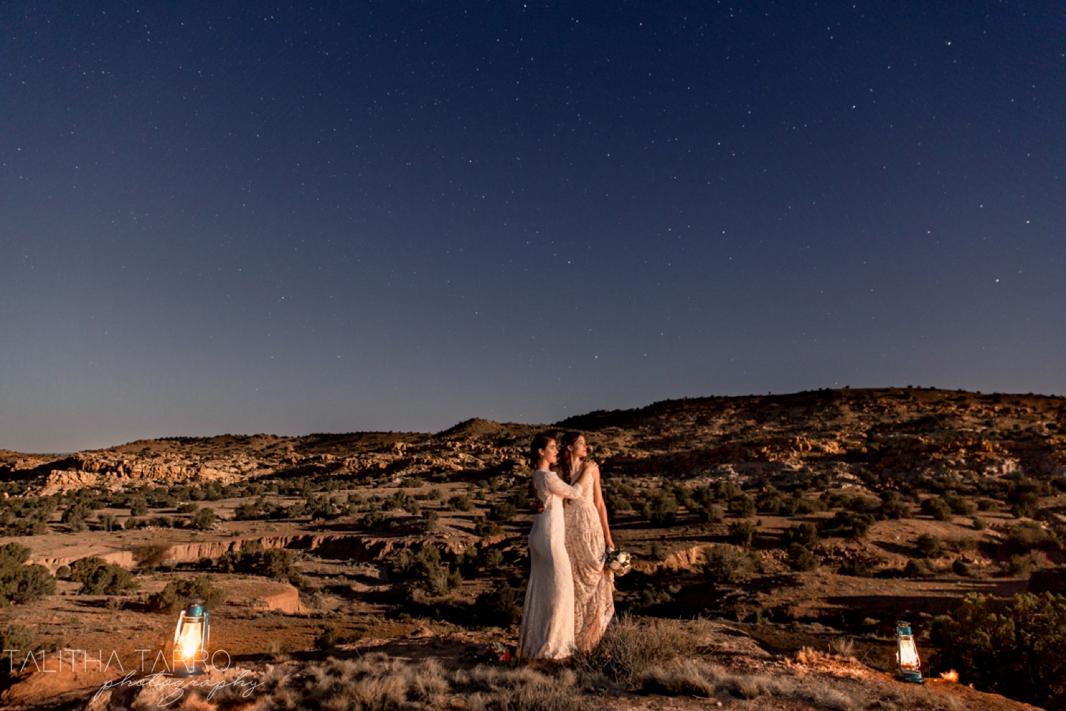 Desert Elopement at night Published May 16, 2019 at 1500 × 1000 in Desert Elopement at night ← Previous Next → Two lovely brides enjoy the moon rising in the distance over the desert landscape